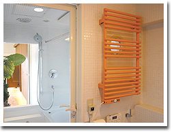 ガラス貼りのユニットバスの横には小さな坪庭。 |