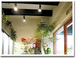 主役の花や観葉植物が映えるように お花屋 ライティングや素材にこだわりました。 |