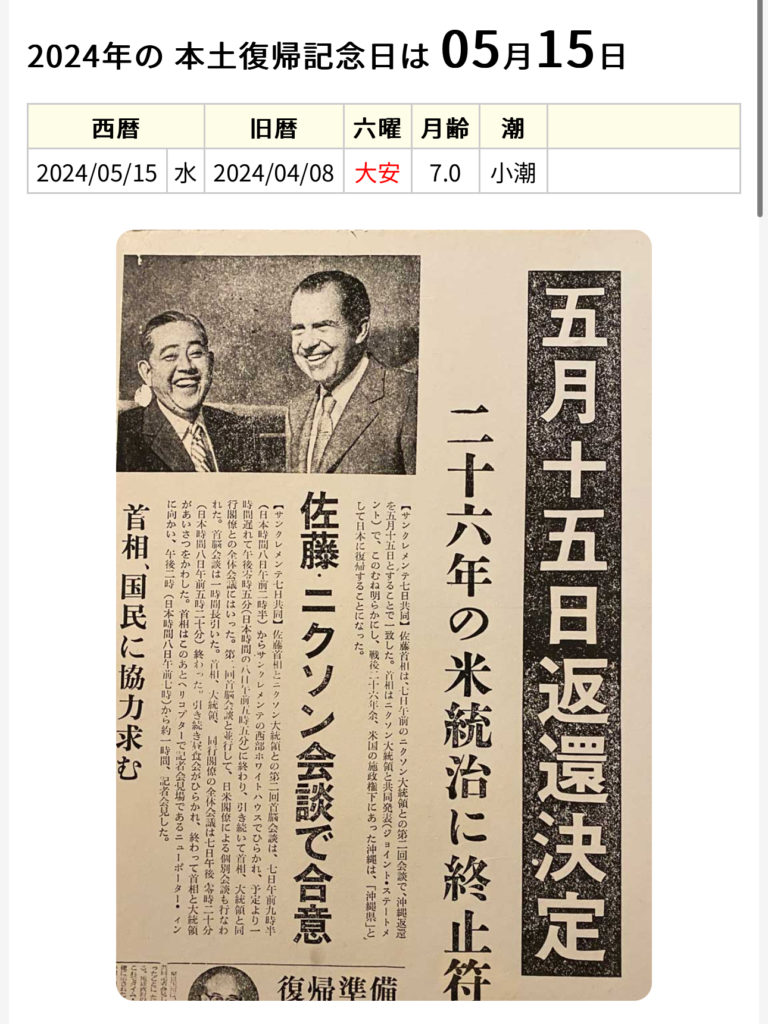 私は日本本土復帰子ですが、1972年5月15日アメリカの施政権が日本に返還され沖縄が本土復帰した日です。私が知る限り特にイベント関連が大きく行われるわけではないと思いますが本土復帰を祈念して沖縄ローカルのTV番組や歴史展などがあるぐらいでしょうか?何にせよ、2024年5月15日が沖縄が本土復帰して52年になりました。復帰時の古い記事を見つけたのでシェアしますね。