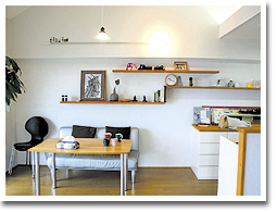 LDKの壁面にはリズミカルに無垢の棚板を配置しました。