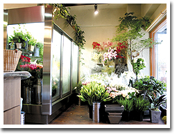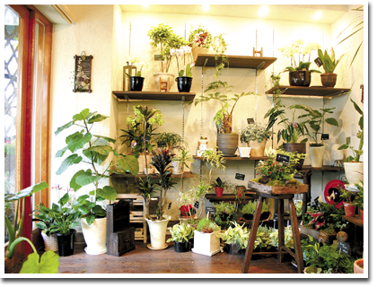 主役の花や観葉植物が映えるように お花屋 ライティングや素材にこだわりました。 |
