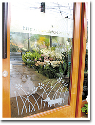 お店の顔であるフロントドアには、看板犬をあしらったルーミンオリジナルサンドブラストを。 |